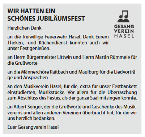 würden. Der Verein braucht Sängerinnen und Sänger, daher bitten wir, neue und alte Sänger, verschließt Euch nicht, kommt zu uns.